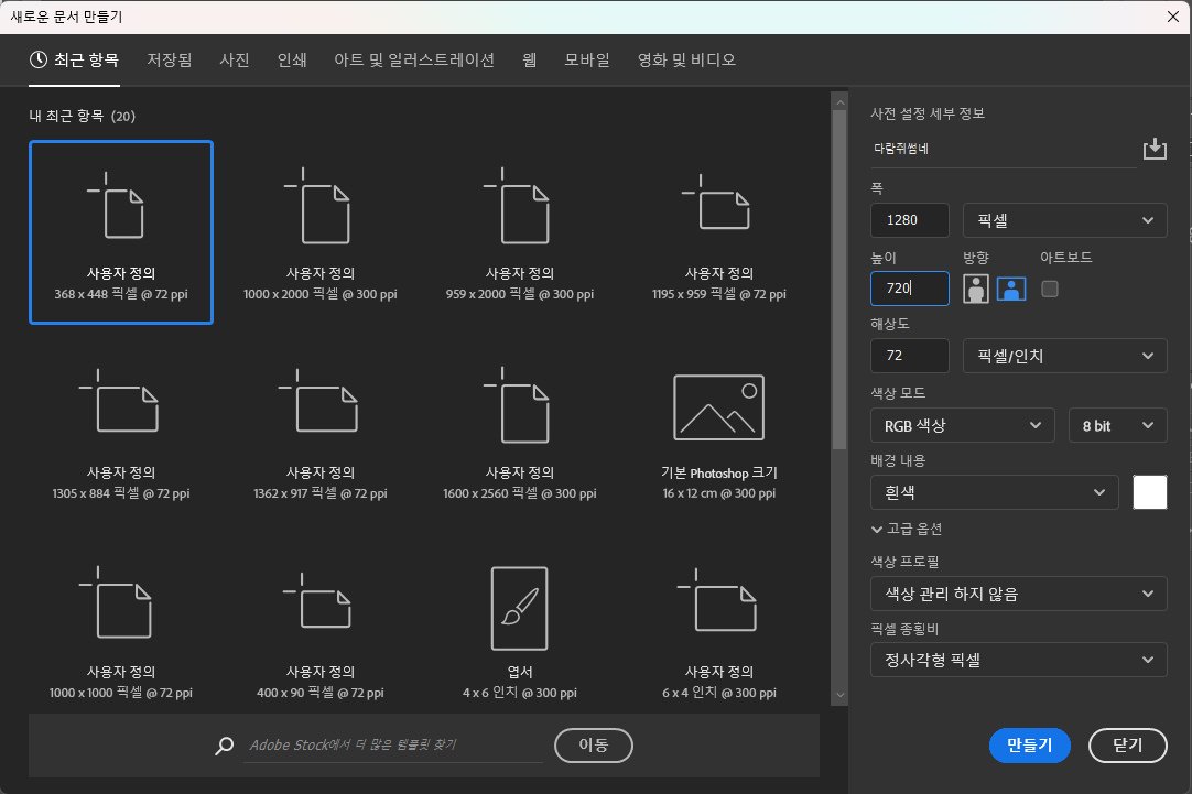 먼저, 새로운 문서를 열고 적절한 해상도를 설정합니다.