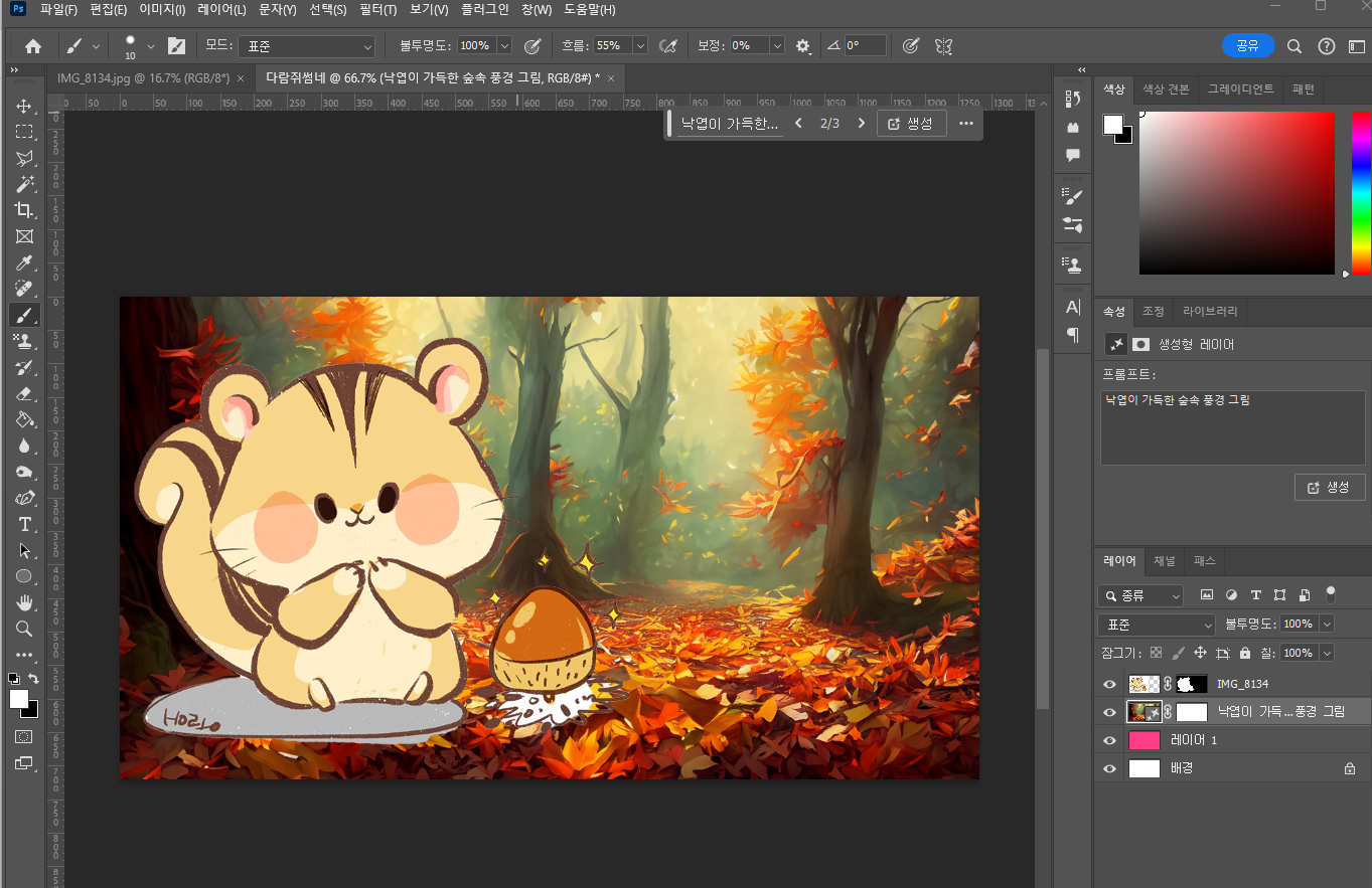 여기서 뭔가 나는 더 꾸며주고 싶다 하면 포토샵 생성형 채우기 기능을 활용합니다.